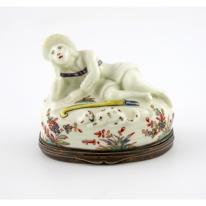 c.1740, modelled as a reclining shepherd, resting his head on his right hand, his crook and his dog lying on the ground beside him, the tall oval base decorated with sprays of Kakiemon flowers, with similar sprays painted to both sides of the flat base, 7.6cm across.