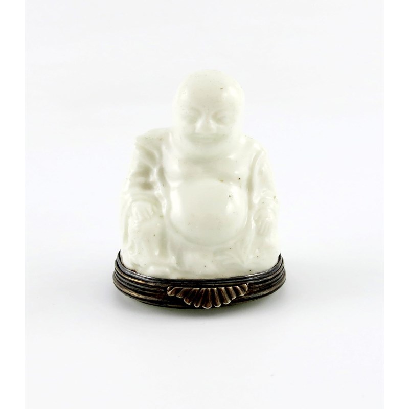 c.1745, modelled in the blanc de Chine manner as the pagoda figure of Buddhai Ho Sheng, the rotund Chinese monk seated with belly exposed, his robes moulded with flower sprays, echoed to the hinged flat cover, the silver mount with Paris discharge marks for 1744-50, 6.5cm high.