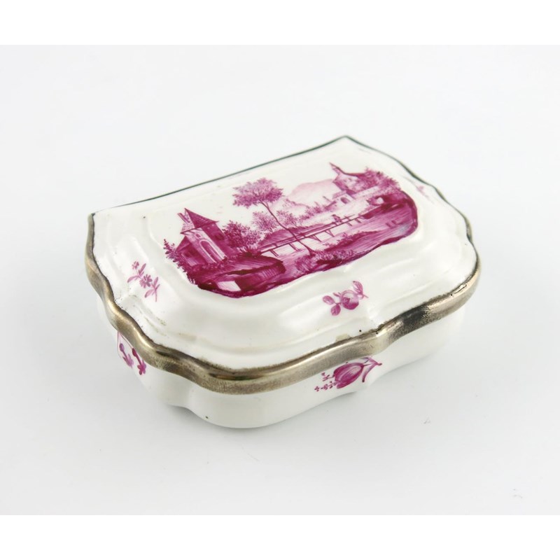 18th century, possibly Fürstenberg, the moulded cover decorated in purpumalerei with a figure crossing a bridge in a European village landscape, the base with a further figure leaning on a spade with mountains beyond, the shaped sides with small flower sprigs, later metal mount, 8cm across.