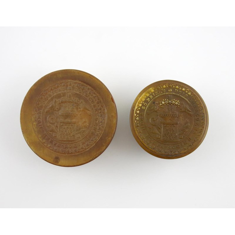 circular form, the covers with a memorial with two flaming hearts, trophies and the motto 'Amor Nos Unio Athea A Morte', diameters 6.5cm and 5.3cm. (2)