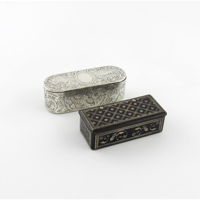 rounded rectangular form, the cover with central vacant cartouche flanked by scene of a pointer and game birds on an intensely engraved rocaille ground of shells and scrolls, the sides with similar decoration, the base with a tiger slaying an antelope, the gilt interior engraved with a presentation inscription: "To Dr Cyner as a small acknowledgement of his Professional Skill & extreme kindness & sympathy in time of trouble from his very sincere and obliged friend I. W. Tully August 1857," length 9.4cm, together with an ebonised and silver-inlaid snuff box, with lattice and star decoration, length 8.2cm. (2)