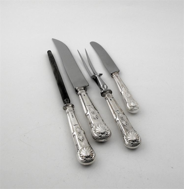 A modern set of twelve Kings pattern, table knives, twelve side knives, serving knife and fork and steel, with stainless steel blades. (27)