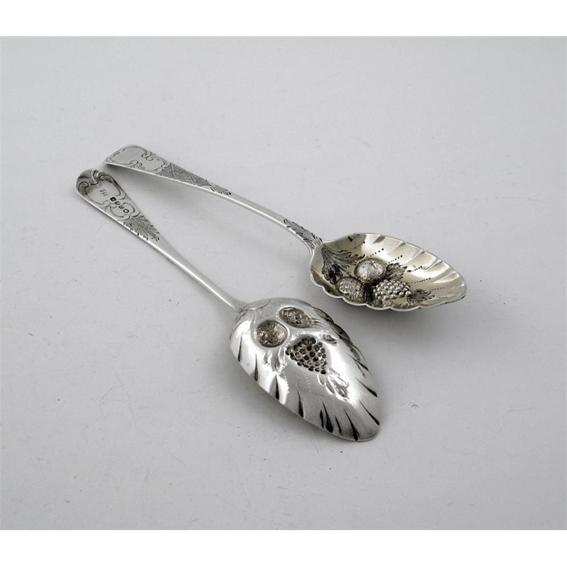 A pair of George III 'berry' spoons, with engraved decoration, gilt bowls, by John Lambe, London 1779, 8.8in (22cm), 3.6oz. (2)