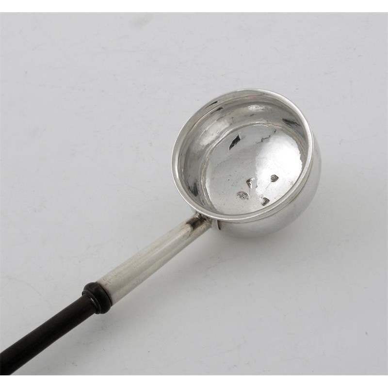 A George II punch ladle, with a turned wooden handle and a circular bowl, scratched 'M' over 'IH' on the base, by R. Lucas, London 1731, 13in (33cm) long.