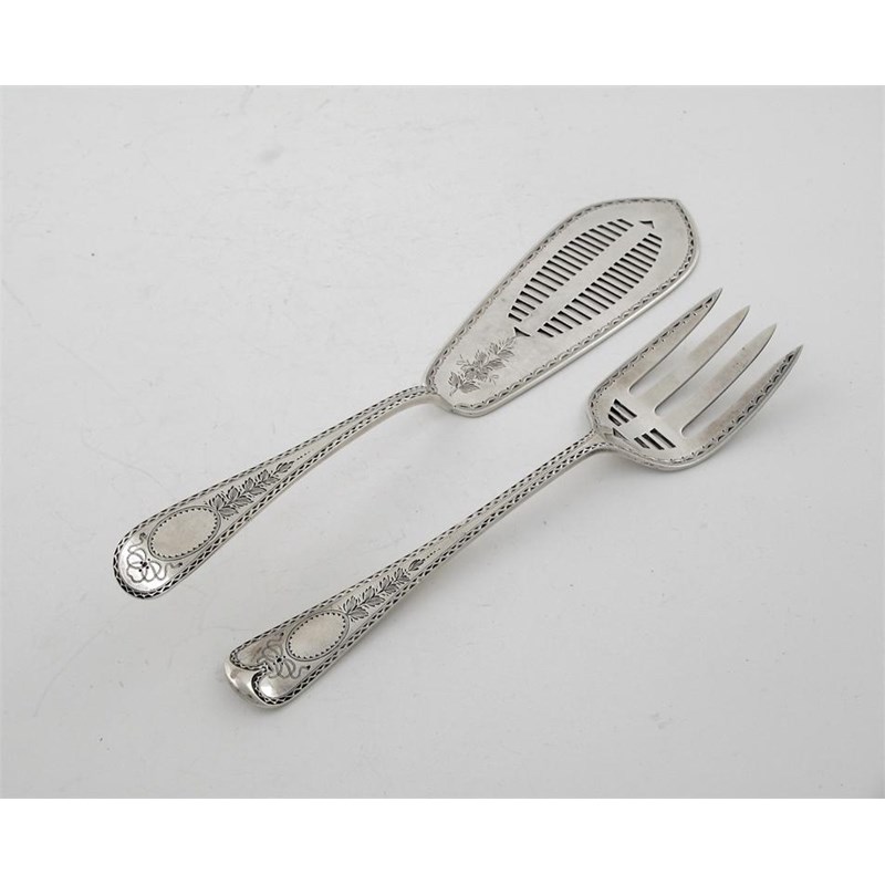 A pair of Victorian bright cut fish servers, with a slot pierced blade and tines, by Edward Gilbert, London 1886, 6oz. (2)