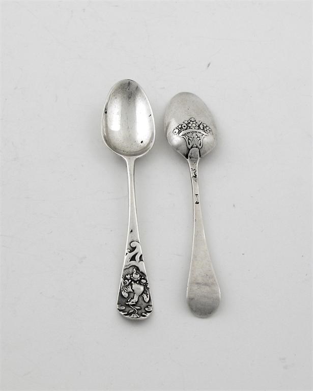 A pair of George II fancy-back teaspoons, with a vase of flowers below the drop and decorated with bird with an olive branch in it's beak on the front of the terminals, maker's mark distorted, London c.1745, 1oz. (2)