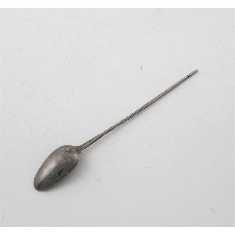 A rare George III Scottish provincial masking spoon, with a long, twisted stem and a double-drop bowl, scratched "IW" maker's mark only "IA", possibly by John Argo, Banff c.1780, 7.25in (18.3cm) long.