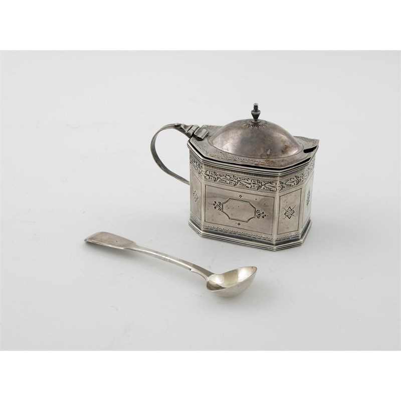 A George III mustard pot, with bright-engraving, a domed cover and a knop finial, (blue glass liner), maker's mark lost in engraving, London 1795, together with a later spoon, 2.95in (7.5cm) high, 3oz weighable silver. (2)