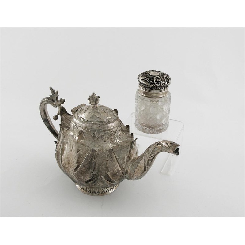 A Victorian silvergilt mounted cut glass smelling salts bottle, embossed with birds and flowers, by Sampson & Morden & Co, London, 1896, together with a late 19th/early 20th century Indian teapot, embossed and chased all over with leaves and pricked decoration, with scratch weight "17.0". (2)