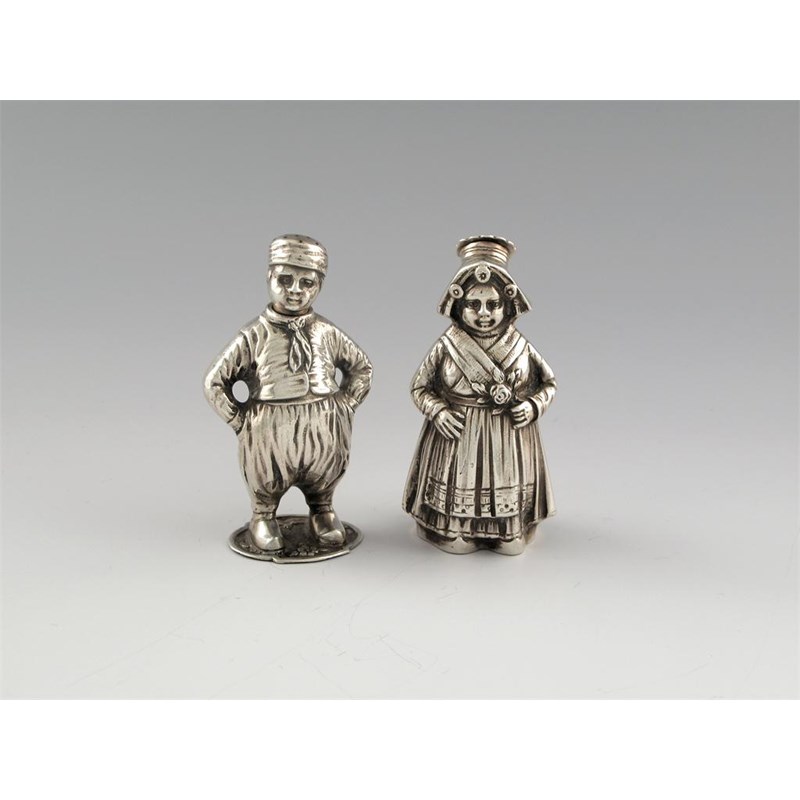 A late 19th/early 20th century Dutch novelty pepperette, in the form of a girl in costume and another in the form of a peasant body, approximately 3.6in (9.2cm) high, 5oz. (2)
