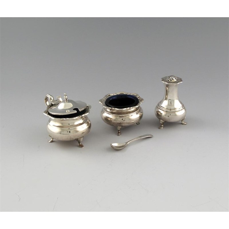 A modern three piece circular cruet set, with shaped borders, two blue glass liners and two later spoons, by Atkin Bros, Sheffield 1922, 6.5oz weighable silver.