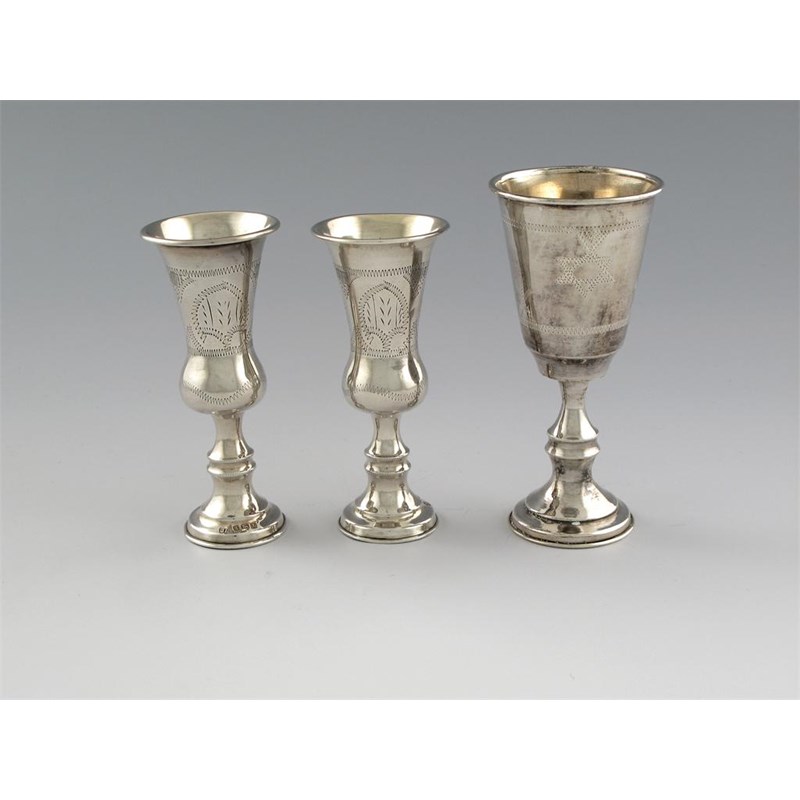 Judaica: a pair of modern engraved Kiddish cups by J. Rosenthal, London 1914 and another larger example, by A. Tysall, London 1921, the latter 4.3in (11cm) high. (3)