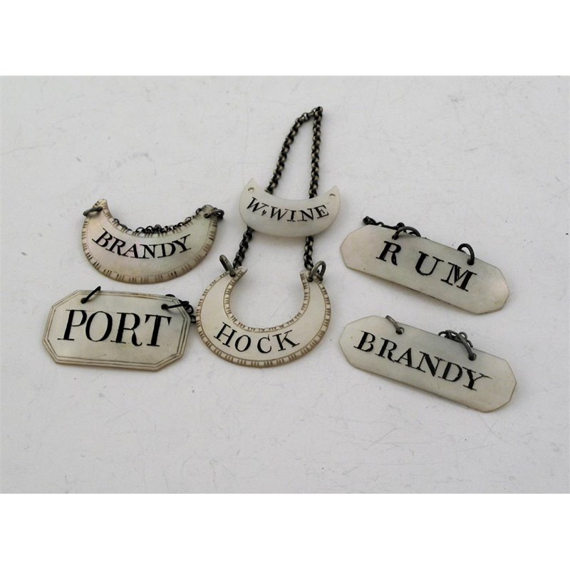Six various George III mother of pearl wine labels: a canted oblong "PORT", a narrow canted oblong "BRANDY" & "RUM", a featheredge crescent "HOCK" a similar "BRANDY" and a plain crescent "W.WINE". (6)