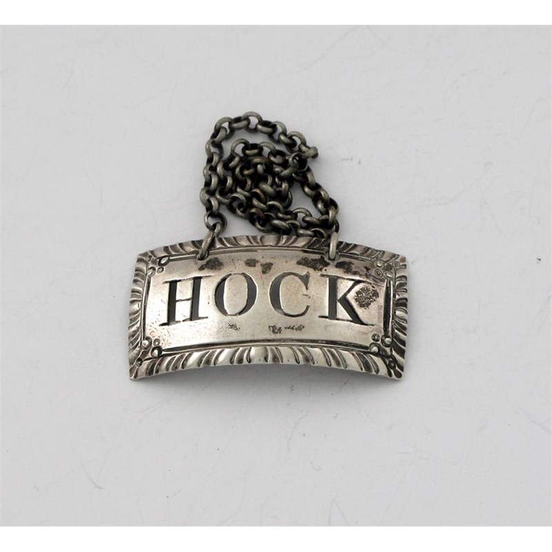 A George III oblong wine label, with a feather edge, pierced "HOCK", maker's mark only, by Thomas Hyde, London c.1770.