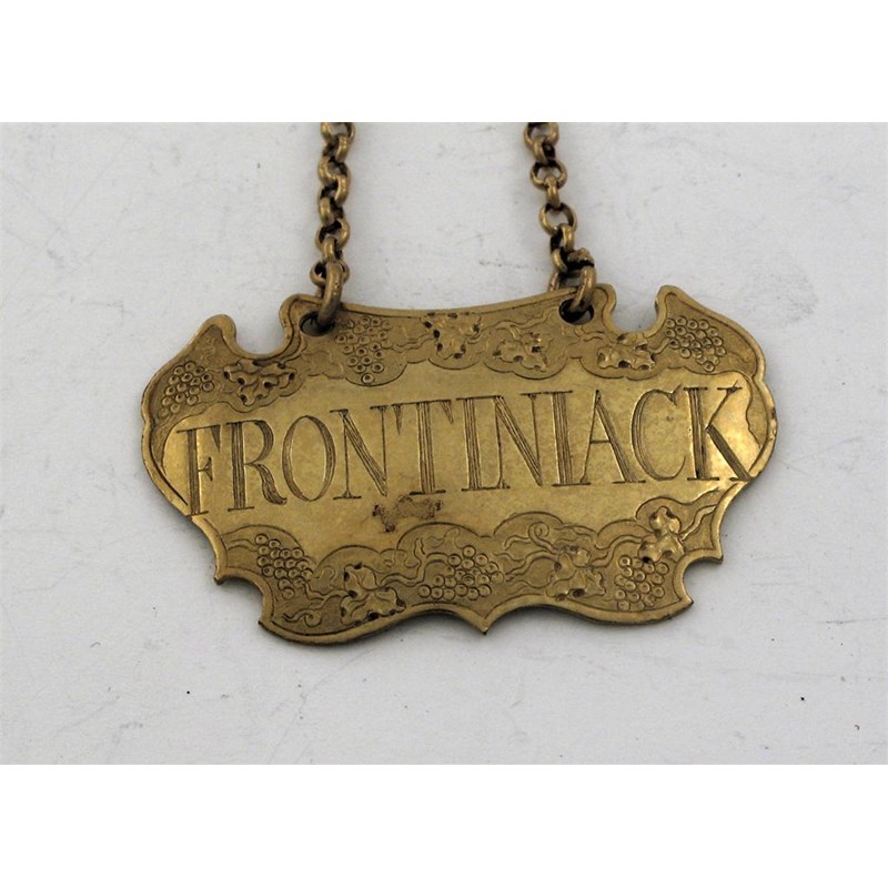 A rare George II "Pinchbeck" wine label, escutcheon form, incised "FRONTINIACK" between borders of fruiting vines, the reverse stamped with the initials "CP" for Christopher Pinchbeck the Younger 1745-50.