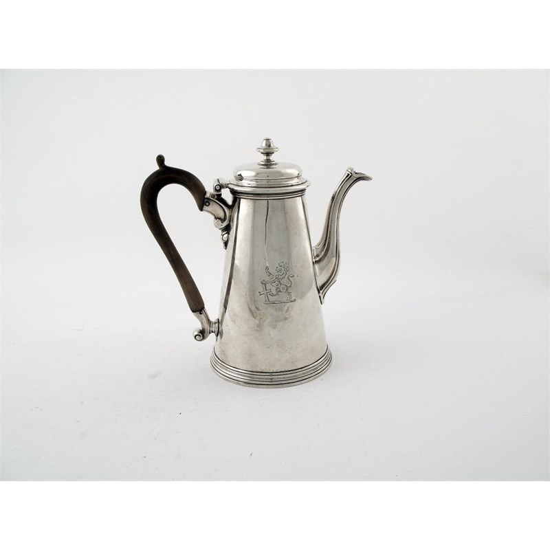 A George II tapering coffee pot, with a skirted base, low-domed cover and knop finial, crested on each side, by Ayme Videau, London 1737, 7.7in (19.5cm) high, 21oz.
