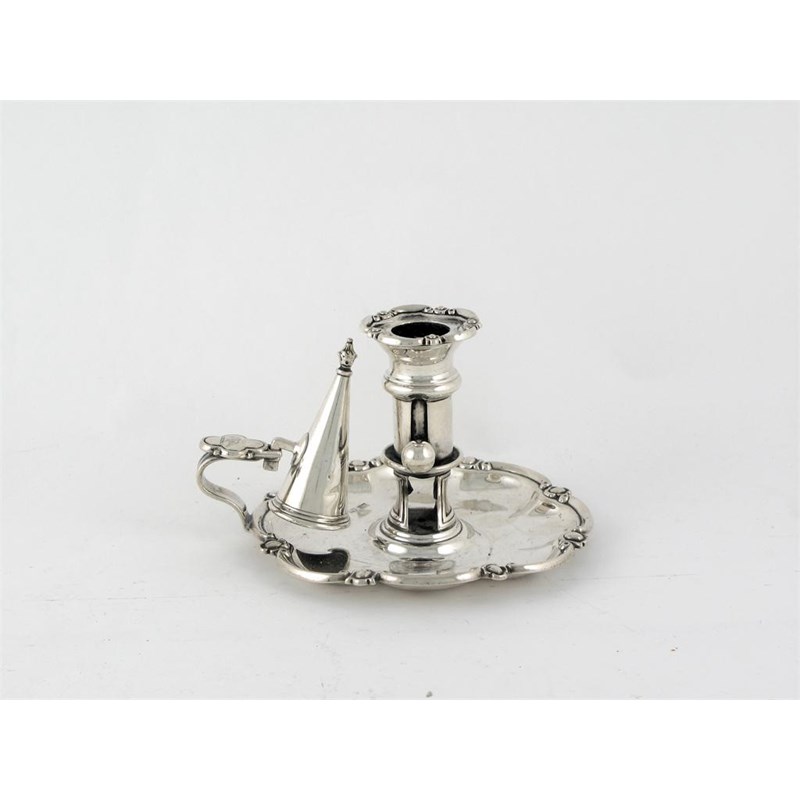 A William IV chamberstick, with a lobed circular base and nozzle, an ejector and a conical snuffer, the thumbpiece crested, by S.C. Younge & Co, Sheffield 1831/32, 5.7in (14.4cm) diameter, 10.5oz.