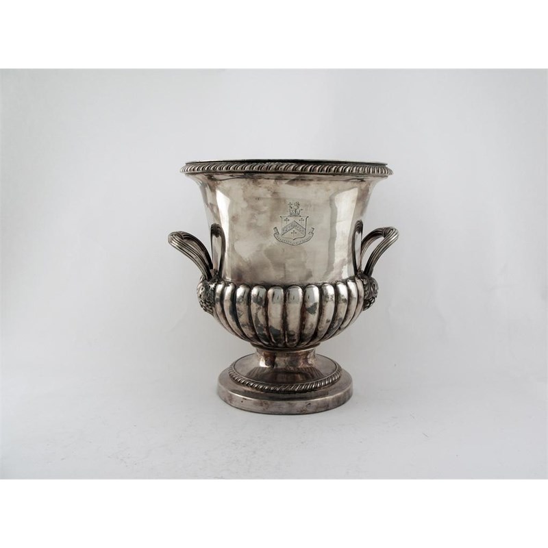 An old Sheffield plated wine cooler, with twin reeded handles, part fluting and a circular foot, engraved on each side with a coat of arms, c.1820, 9.5in (24cm) high.