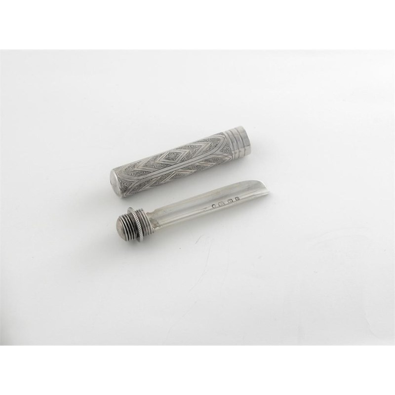 A Victorian travelling apple corer, engraved handle, with blade screwing out from body for use, 5.65in (13.7cm) long including blade, by George Unite, Birmingham 1864.