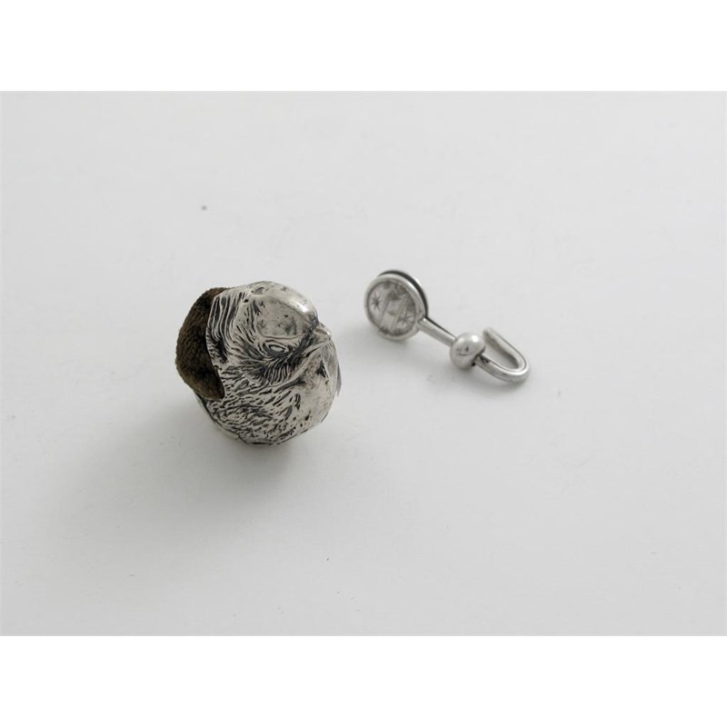 An Edwardian novelty pin cushion, in the form of a hatching chick, by S. Mordan & Co, Chester 1907 and a modern napkin clip, 1.3in (3.5cm) high. (2)