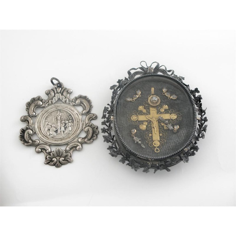 A 19th century reliquary, in the form of a decorative oval frame, fitted with a gold crucifix flanked by diamond set jewels (behind glass) together with an 18th century pendant badge or amulet, bearing only a French duty mark (2), the former 3.8in (10cm) long, 1oz weighable silver.