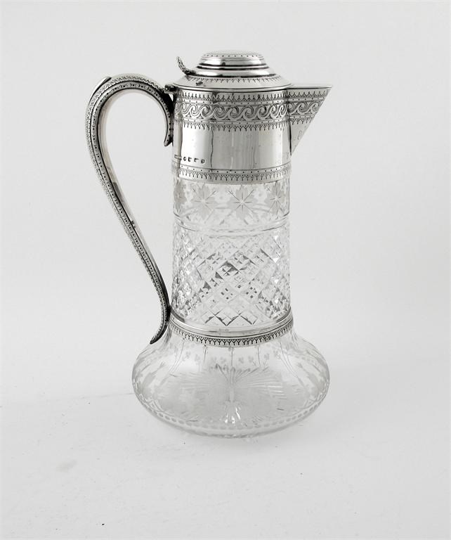 A Victorian mounted cut glass claret jug, with a squat, baluster body, the mount and handle with repeating borders and chased decoration, shell thumbpiece, by H. Wilkinson & Co, Birmingham 1881, 9.5in (24cm) high.