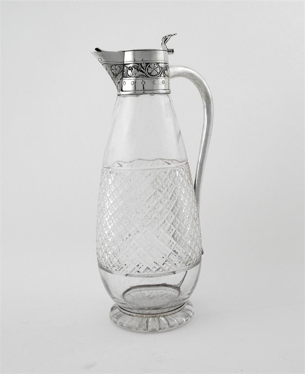 A late Victorian mounted cut glass claret jug, with a vase shaped body, star cut base and a chased frieze of shamrock and flowers around the mount, by Edward Hutton, London 1891, 12.4in (31.5cm) high.