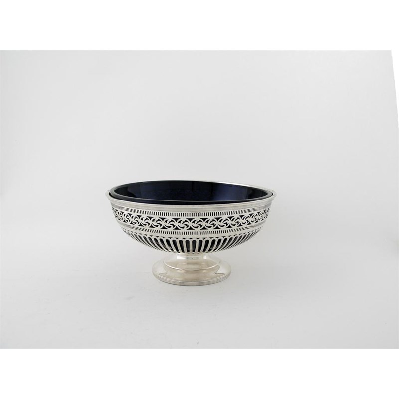 A modern pierced circular dish, on a domed foot, with a blue glass liner, by Mappin and Webb, Sheffield 1929, 9.5in (24cm) diameter, 17oz weighable silver.