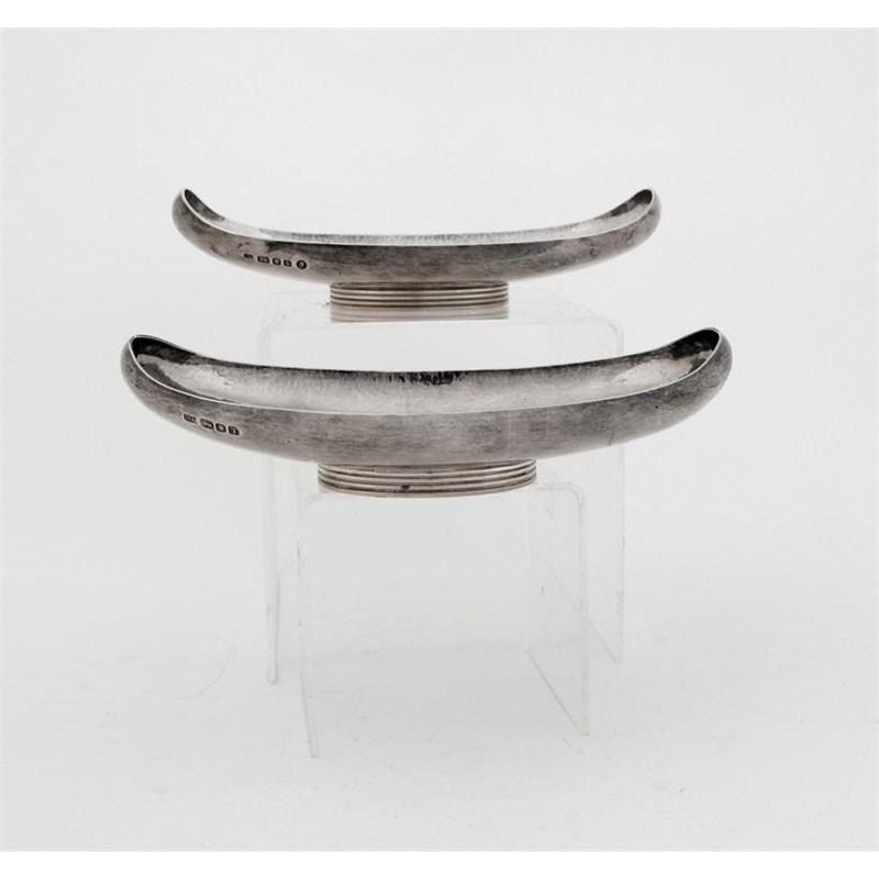 By Leslie G. Durbin: a pair of modern 'hammered' dishes in the form of shallow boats with turned up ends and reeded collet bases, London 1953/54, 8.7in (22cm) long, 27oz. (2)