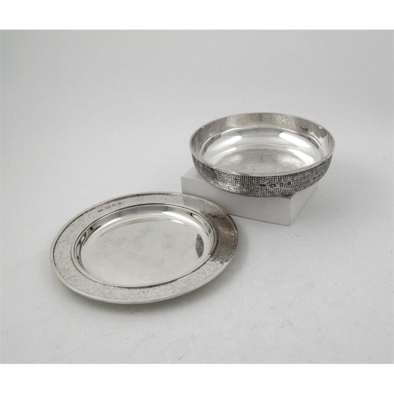 By C.N. Lawrence: a modern shallow circular dish, with a textured centre and textured sides, and a circular side plate with a textured border, London 1971 and 1970 respectively the plate 7.2in (18.2cm) diameter, 19oz. (2)
