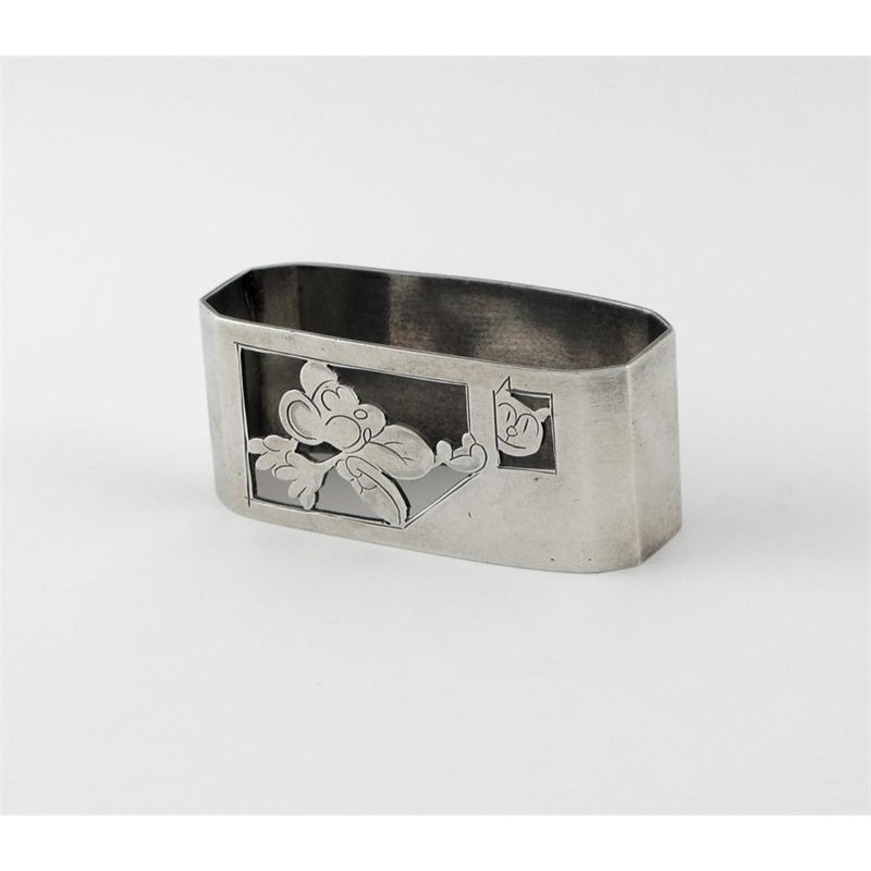 Disney Interest: a plated napkin ring, pierced and engraved with Mickey Mouse running from Felix the cat, maker's mark "NC" c.1930.