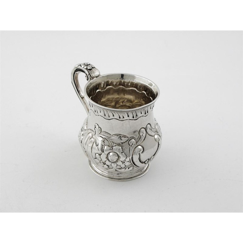 A George IV christening mug, with embossed decoration of flowers and swags to the lower body, vacant cartouche, scroll handle, gilt interior, by John Baddeley, London 1825, 3.5in (8.4cm) high, 3.7oz.