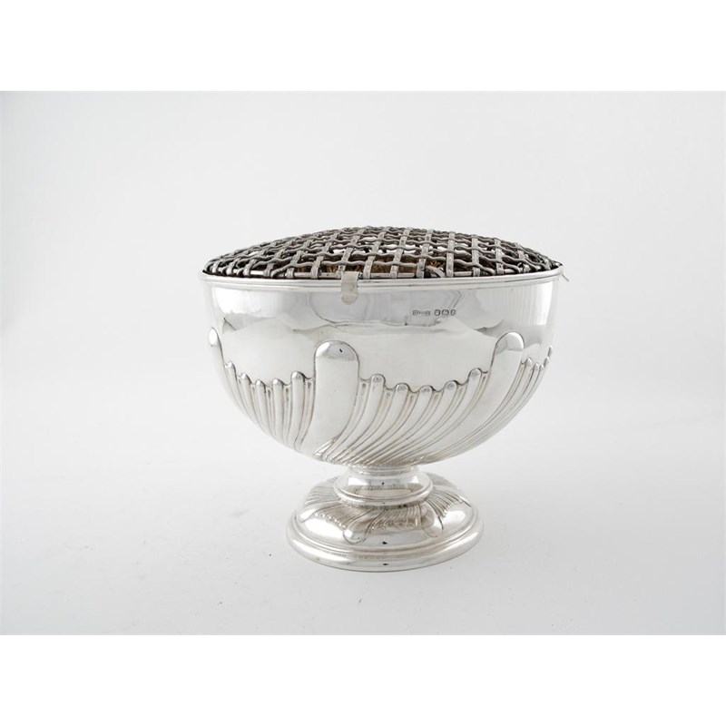 A late Victorian rosebowl, on a domed foot, decorated with gilt interior, wrythen fluting, by James Dixon & Sons, Sheffield 1897 (with plated gridle), 8.25in (21cm) diameter, 19.5oz weighable silver.