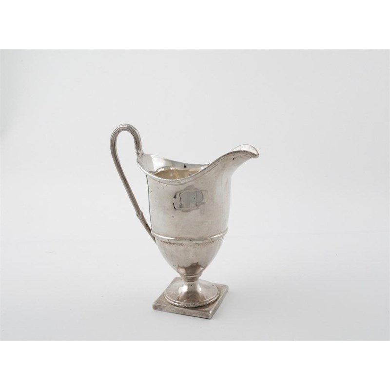 A George III helmet cream jug, on a square pedestal with a reeded loop handle, crested, by William Abdy (II), London 1806, 6.25in (16cm) high , 5.5oz.