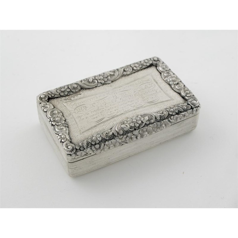 A William IV oblong snuff box, with reeded side and raised floral borders, the cover inscribed 'Presented along with a pair of globes to M R Peter Mackay Teacher Gifford by his friends in the parish and its vicinity as a mark of thier appreciation of his unwearied zeal in the education of youth 1st July 1833' gilt interior, by Thomas Shaw, Birmingham 1833, 3in (7.5cm) long, 3oz.