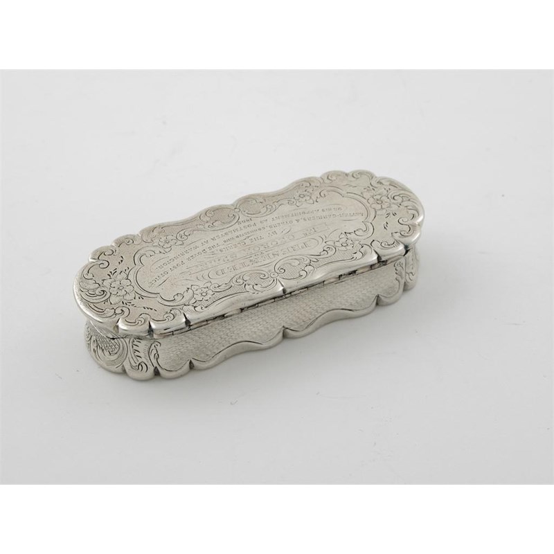 A Victorian engraved snuff box, of shaped rounded oblong outline, inscribed on the cover 'Presented to Mr George Spain by the clerks, letter carriers and others connected with the Dover post office 1862', by Frederick Marsden, Birmingham 1861, 3.75in (9.6cm) wide, 3oz.
