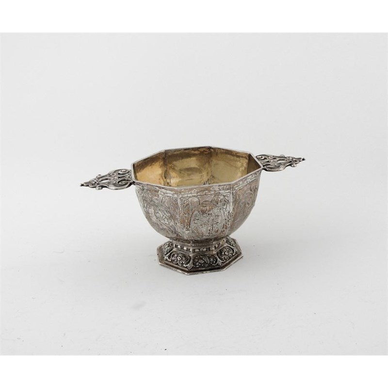 A 19th century Dutch octagonal brandy bowl, in the late 17th century manner, with two cast openwork handles, and cast foot, engraved scenes around the body, gilt interior, pseudo marks, 3.5in (8.9cm) high, 9oz.