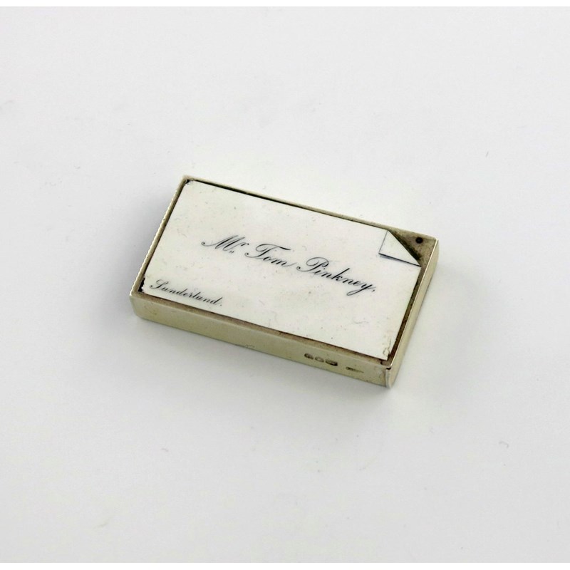 rectangular form, hinged cover, enamelled 'Mr. Tom Pinkney,' and 'Sunderland', on a white ground, the interior of the cover inscribed 'Christmas 1891', length 5.7cm, approx. weight 1.2oz.