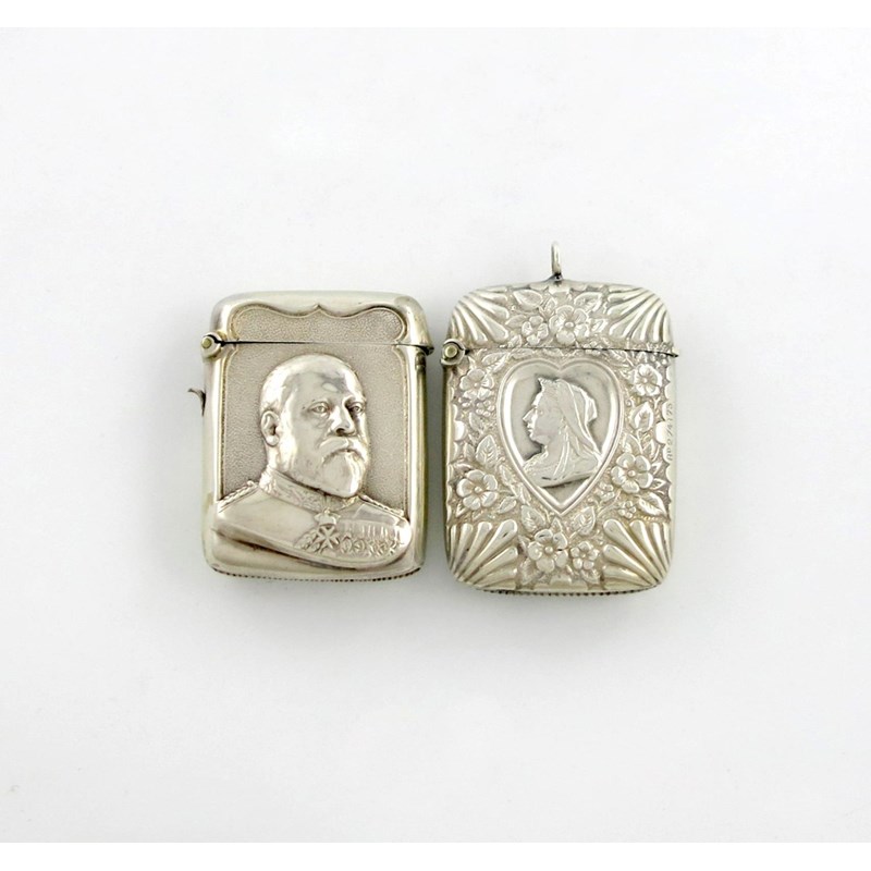 rectangular form, embossed with a portrait of Edward VII, length 4.8cm, plus a Victorian silver commemorative vesta case, by Charles Lyster and Sons, Chester 1900, embossed with a portrait of Queen Victoria in a heart-shaped cartouche, length 5.2cm, approx. weight 1.8oz. (2)