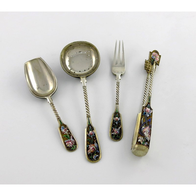 A four-piece Russian silver and enamel serving set