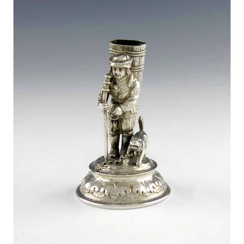 modelled as a standing man with a basket on his back, with a staff and a dog at his feet, on a raised circular foot, height 8.8cm, approx. weight 3oz.
