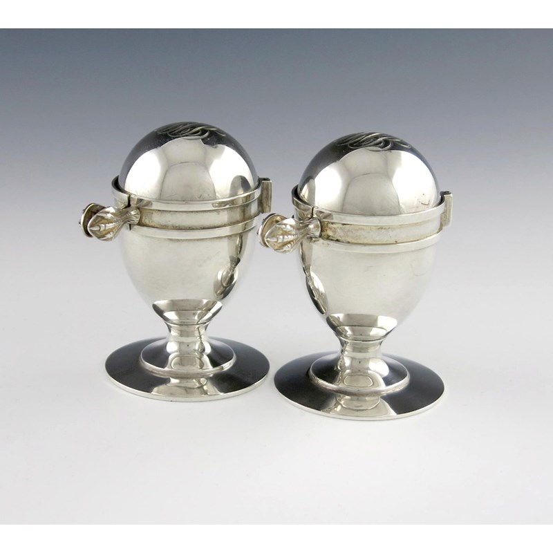 circular tapering form, with two hinged cutters with chicken feet handles, domed cover, engraved with an initial, on a spread circular base, height 9cm, approx. weight 8oz. (2)