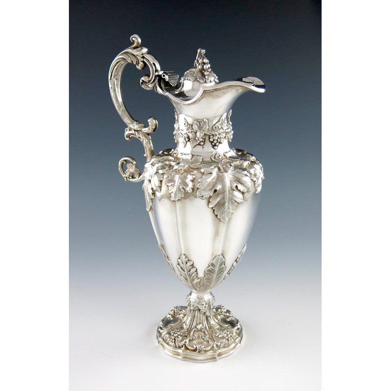 lobed circular baluster form, embossed vine-leaf decoration, scroll handle, domed cover with a bunch of grapes finial, on a raised circular foot with grapes, height 32.5cm, approx. weight 24oz.