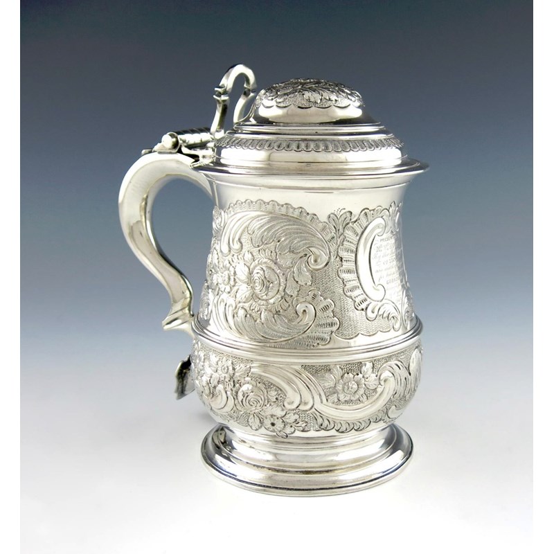 baluster form, later embossed foliate scroll decoration, with a presentation inscription, domed hinged cover with a pierced thumb-piece, scroll handle with a shield-shaped terminal, on a circular foot, height 19.2cm, approx. weight 25.9oz.