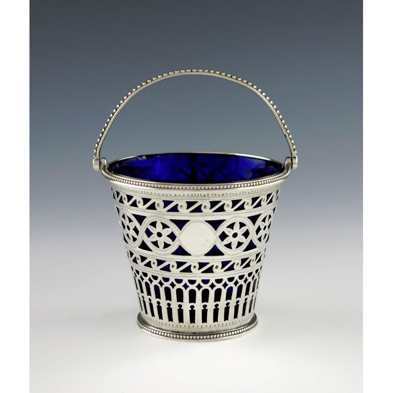 tapering circular form, pierced decoration, beaded borders, with a blue glass liner, height 7.5cm, approx. weight 3.2oz.