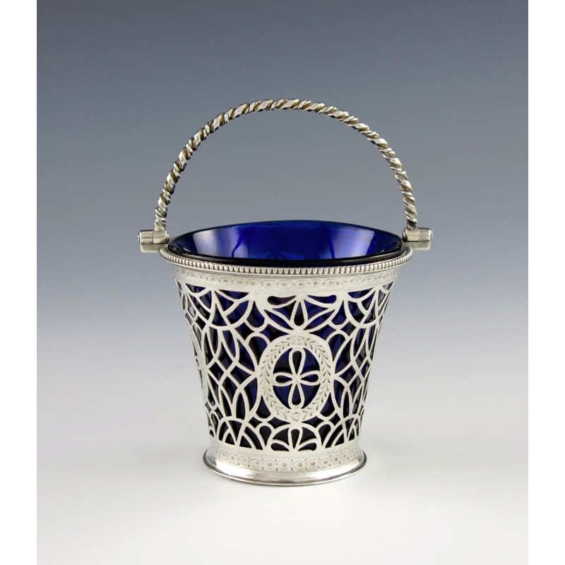 tapering circular form, pierced decoration, bright-cut and beaded borders, with a blue glass liner, height 6.5cm, approx. weight 2.4oz.