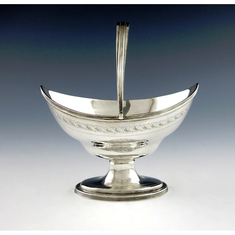 oval form, bright-cut decoration, reeded borders and swing-handle, with two vacant cartouches, on a raised oval foot, length 16.8cm, approx. weight 7.2oz.