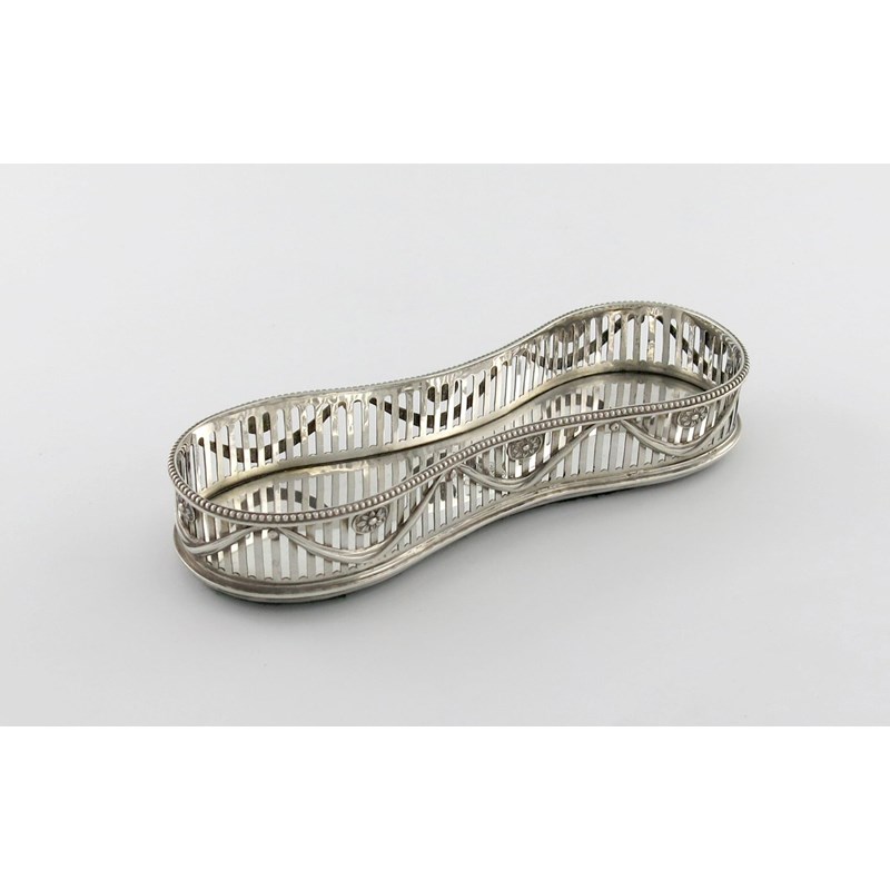 shaped oblong form, with a pierced gallery with oval medallions and drapes, beaded border, engraved with a monogram, wooden base, length 19.7cm.