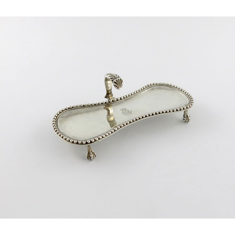 shaped oblong form, beaded border, leaf and bead capped scroll handle, engraved with a crest and motto, on four claw and ball feet, length 18.5cm, approx. weight 5.9oz.