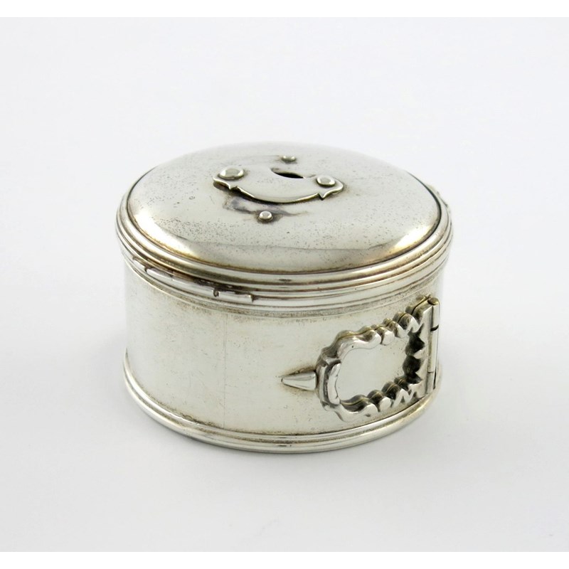 circular form, the side with a hinged handle, the domed hinged cover with a cutter, diameter 5cm, approx. weight 1.5oz.